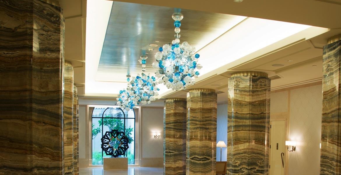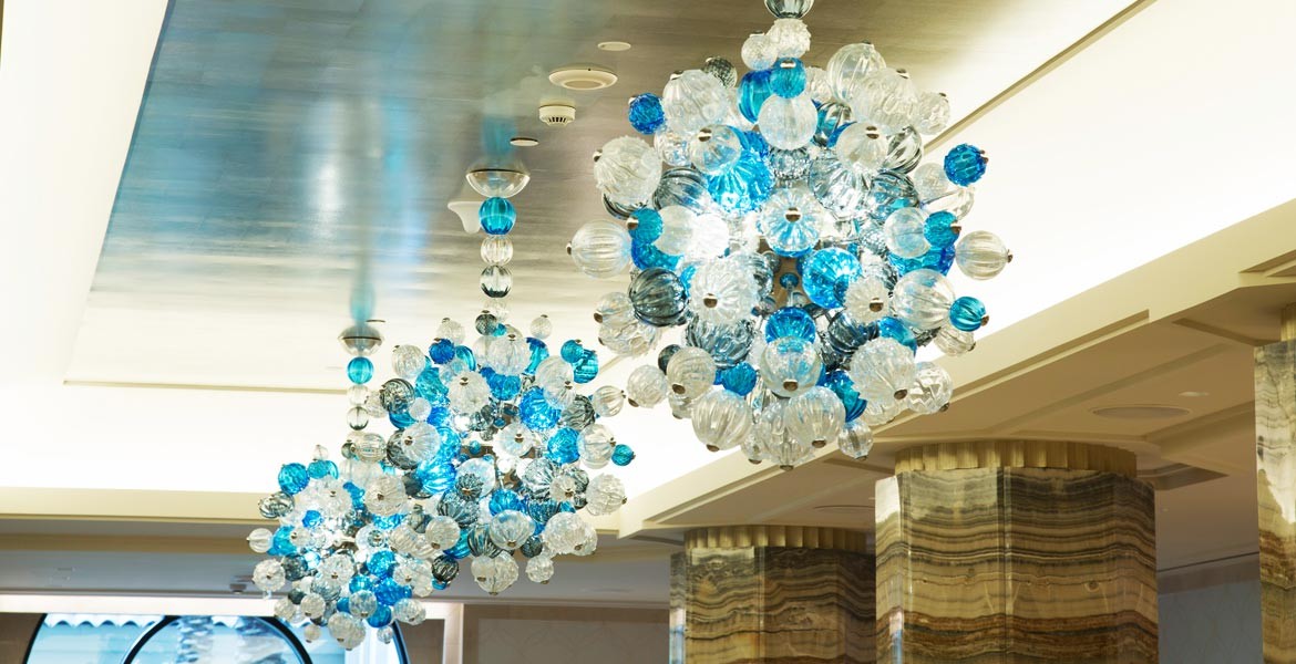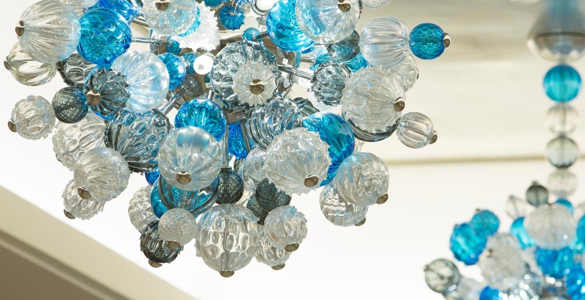 A series of custom Murano chandeliers designed by Seguso with a contemporary style and modern, refreshing colors, line the hallway exit at an exquisite Four Seasons Resort.
