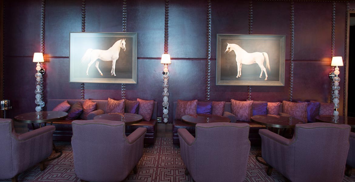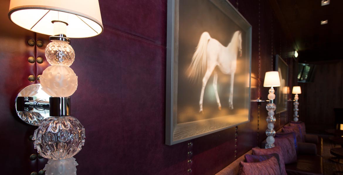 A collection of custom made wall sconces convey cool style and sophistication to a deluxe bar/lounge area. The series of glass spheres are customizable by using a series of techniques and colors, which showcase the unique craftsmanship of Seguso Murano glass.