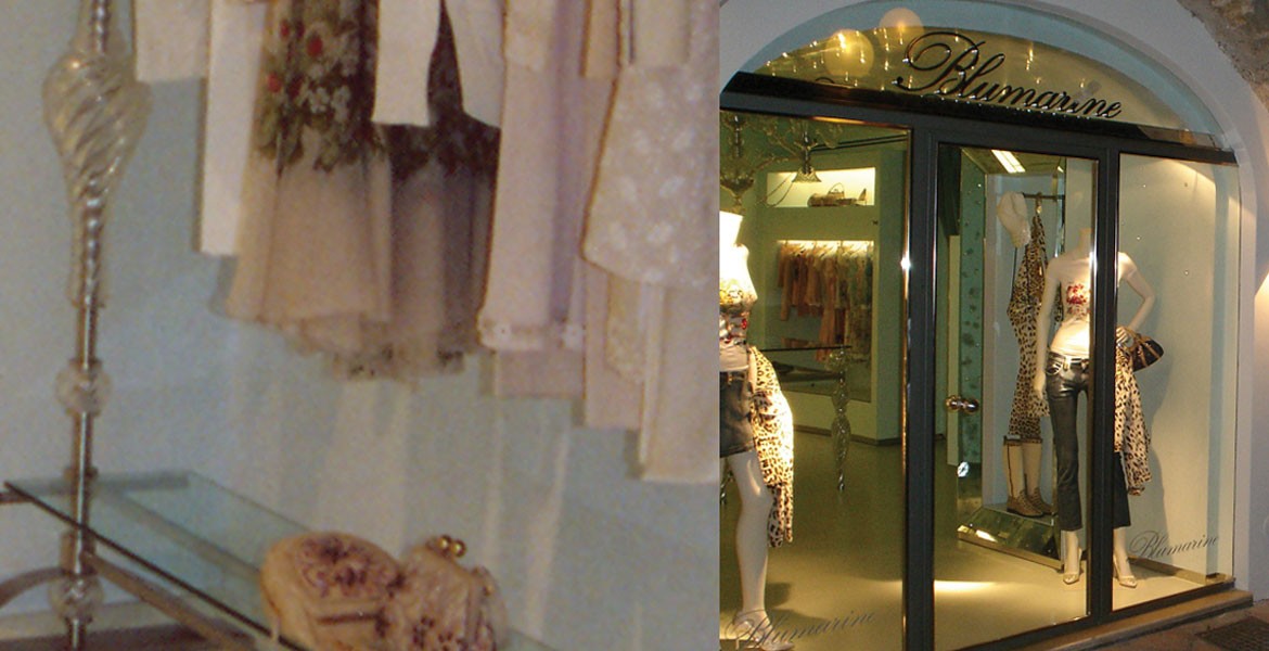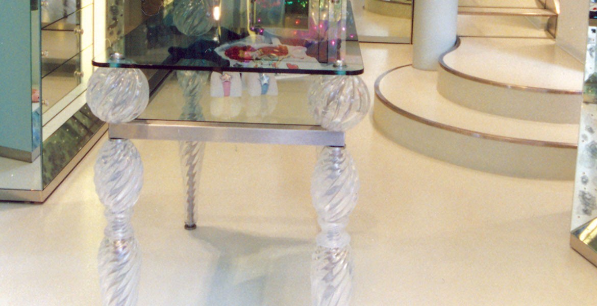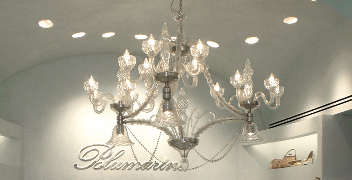 Seguso glass lighting, furniture and accents were used as the central theme and store concept for all Blumarine boutiques worldwide. The luminosity and sophistication of the Murano glass designs complimented the high end fashion styles being displayed in the store.