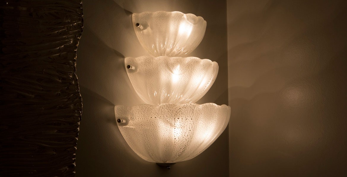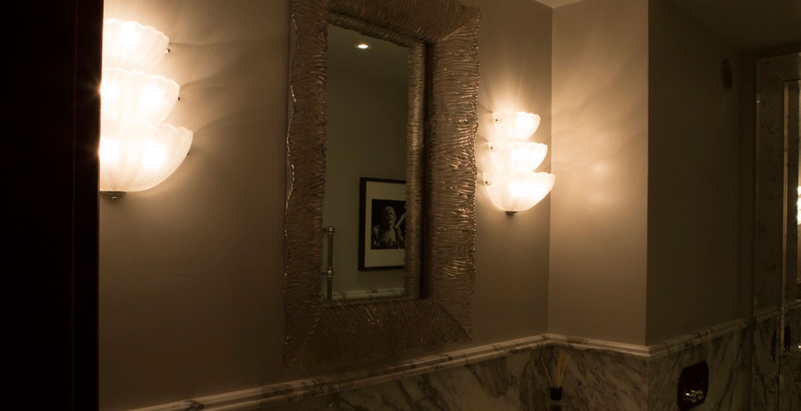 Murano glass sconces produced by Seguso for a bathroom vanity in a private residence.