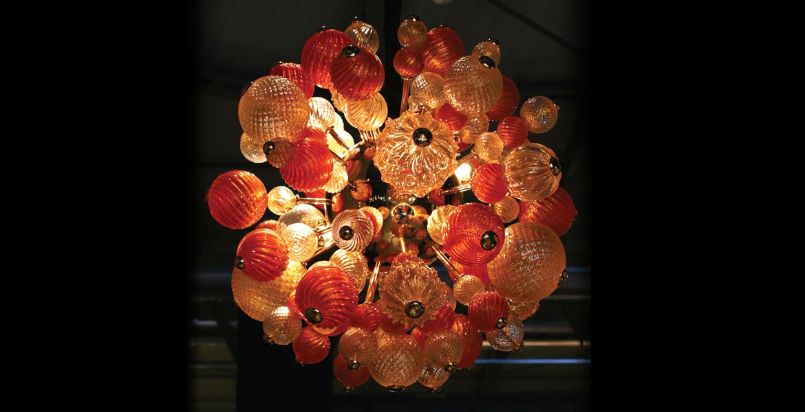 The Sfera chandelier by Seguso is an example of lighting in a contemporary style that utilizes a variety of colors and techniques, which can be produced to custom specifications.