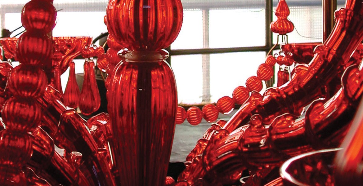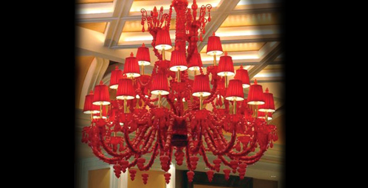 A series of custom chandeliers in vibrant red, produced by Seguso for the Wynn resort in Las Vegas.